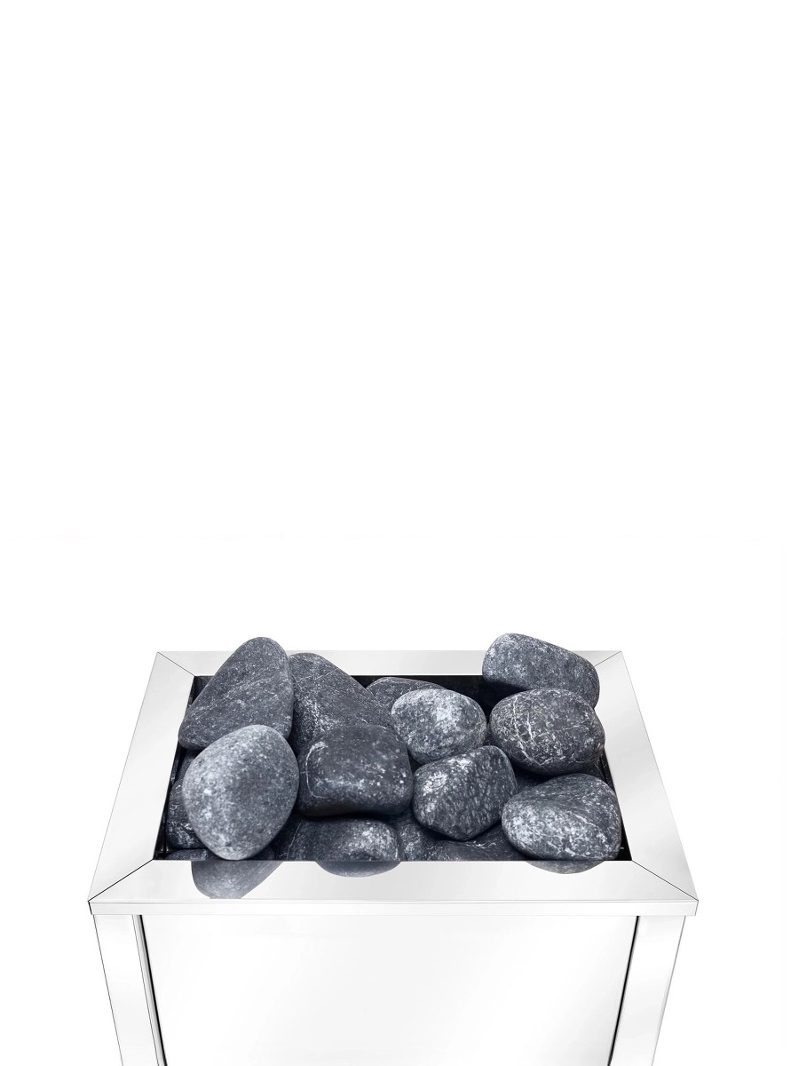 Представленная модель электрокаменки имеет отсек для камней, который вмещает до 15 кг. Она монтируется напольно.