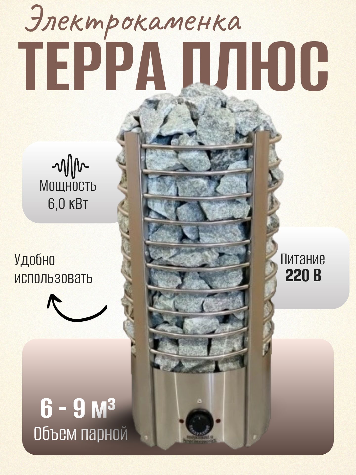 Внутри электропечи размещен термостат, с рукояткой для управления температуры в сауне (температурный датчик выносится и подвешивается в парильне, регулирует именно температуру в сауне, а не температуру в каменке, что исключает раннее отключение нагрева при не достижении нужного температурного режима в парилке).