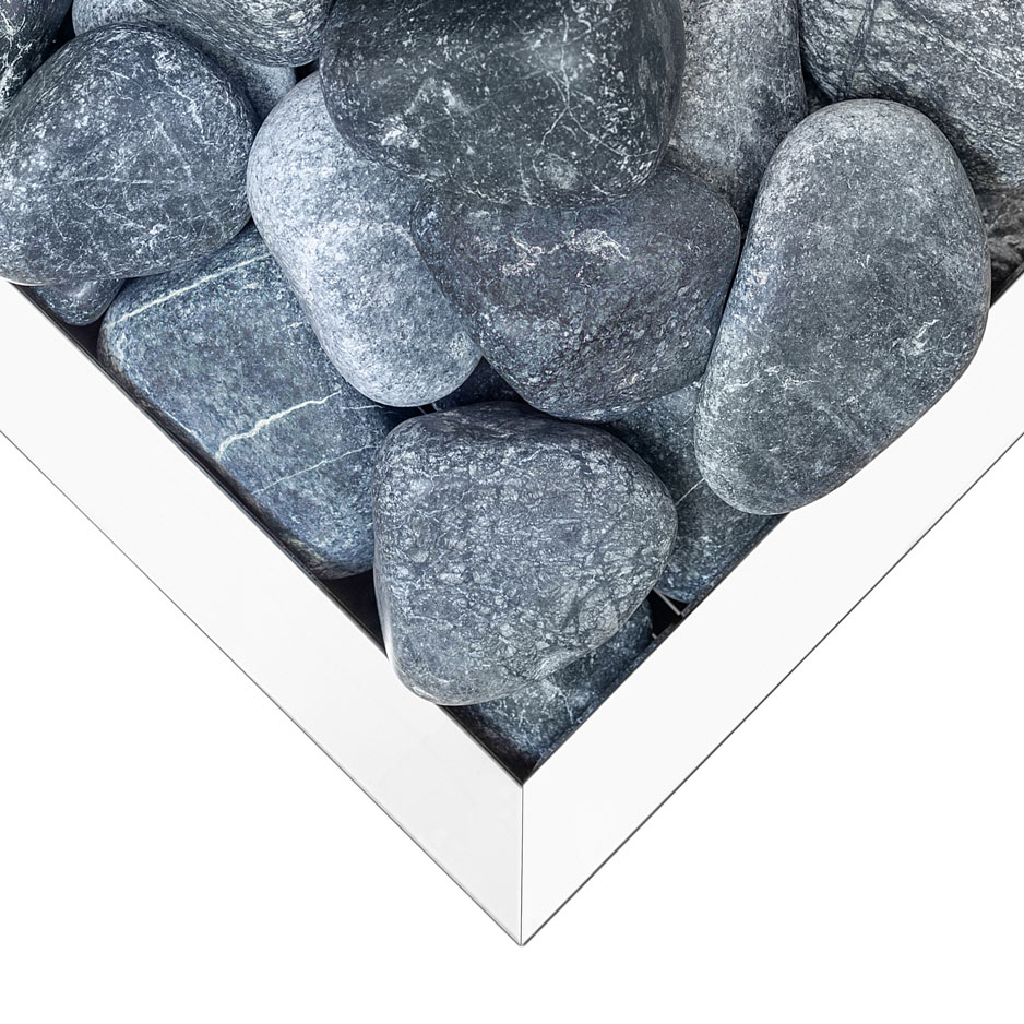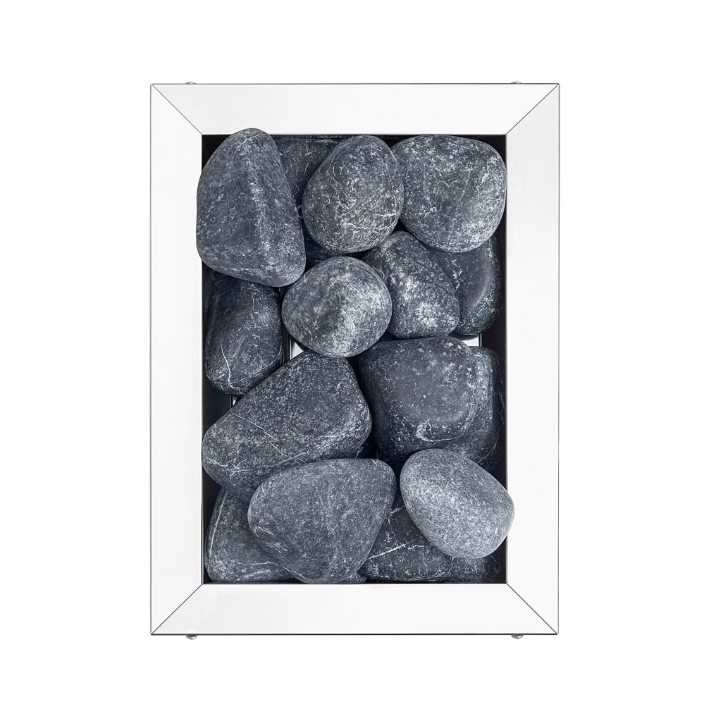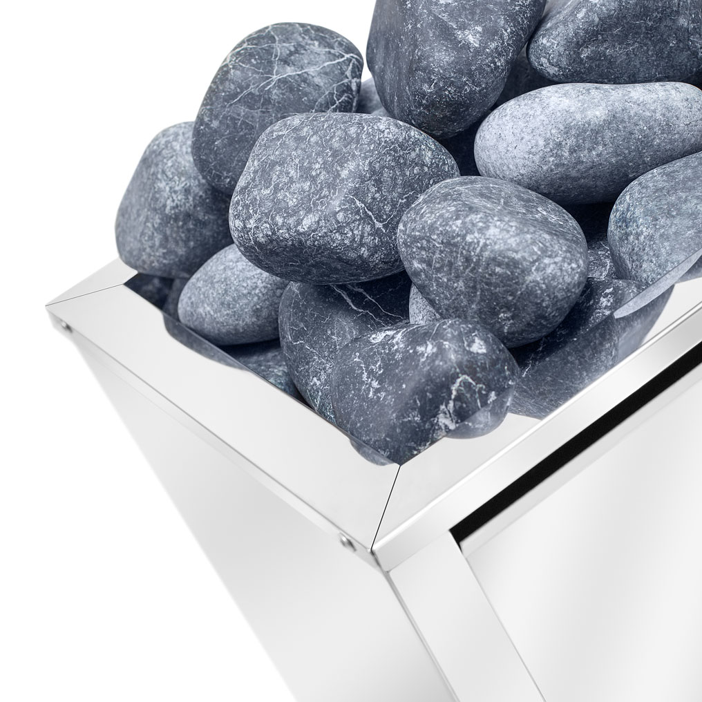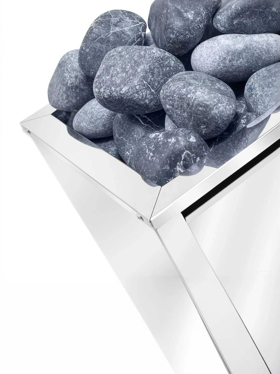 Представленная модель электрокаменки имеет отсек для камней, который вмещает до 25 кг. Она монтируется напольно.