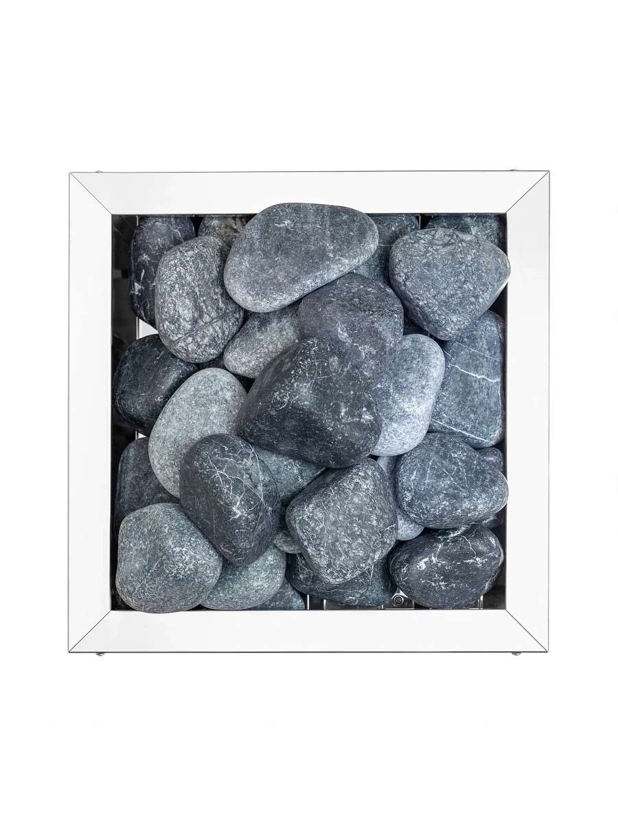 Представленная модель электрокаменки имеет отсек для камней, который вмещает до 35 кг. Она монтируется напольно.