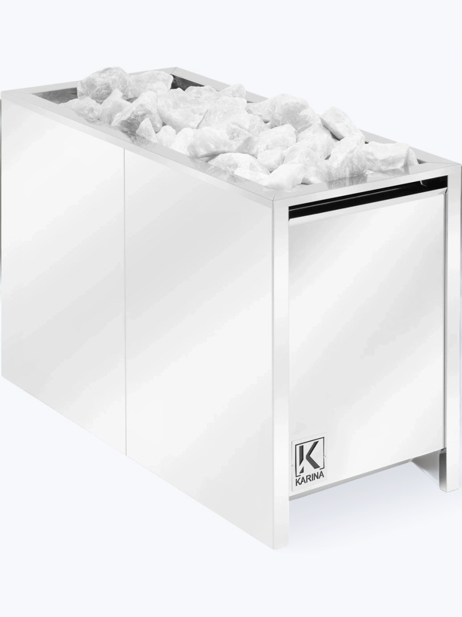 Представленная модель электрокаменки имеет отсек для камней, который вмещает до 55 кг. Она монтируется напольно.