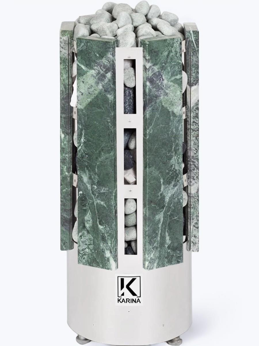 Натуральный змеевик, которым облицован цилиндрический корпус электрокаменки, шикарно смотриться в интерьере. А целебные свойства минерала позволяют отнести печь к оздоровительной серии.