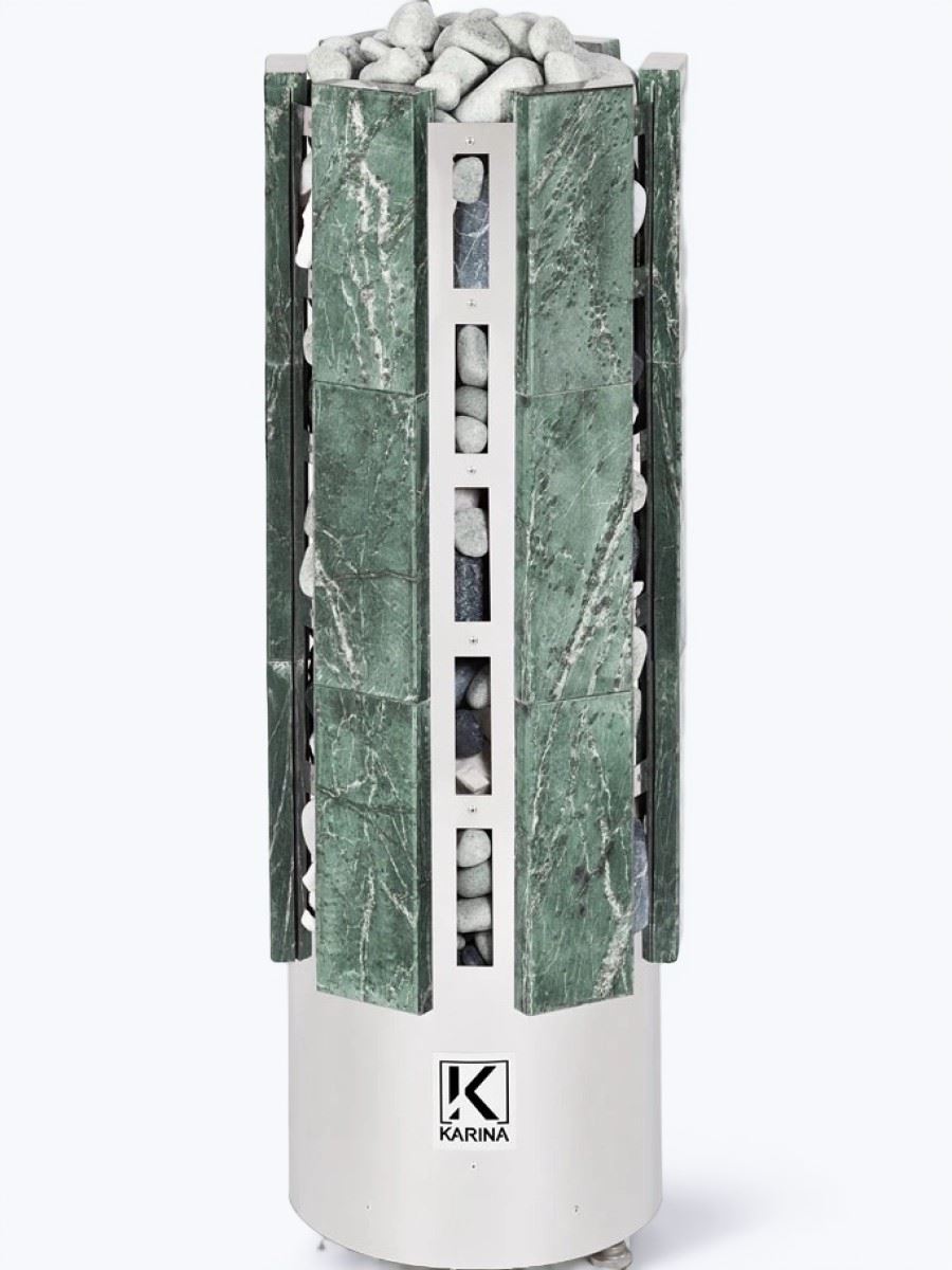 Натуральный змеевик, которым облицован цилиндрический корпус электрокаменки, шикарно смотриться в интерьере. А целебные свойства минерала позволяют отнести печь к оздоровительной серии.