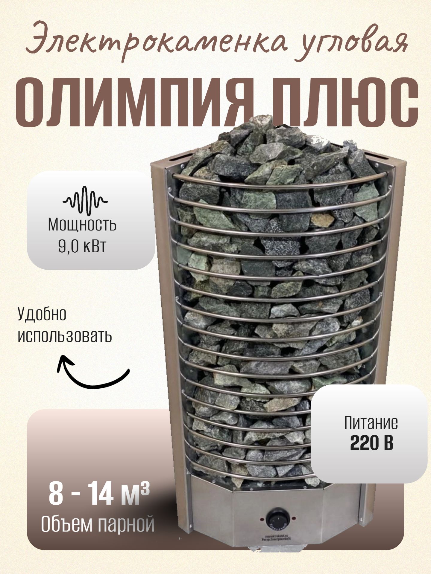 Олимпия изготовлена из высококачественной нержавеющей стали, вмещает от 55 до 75 кг камней и обеспечивает большую поверхность контакта с водой, что позволяет регулировать характер тепла от мягкого до сильного.