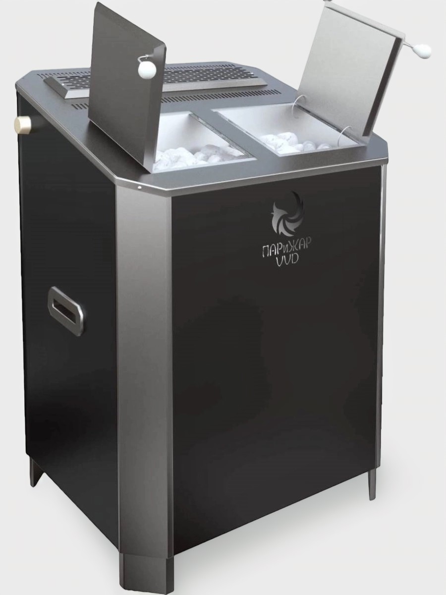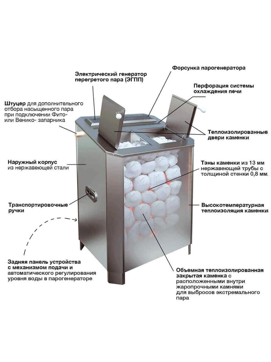 Учитывая отзывы и пожелания клиентов, в новых электропечах предусмотрена закрывающаяся дверью (дверями) теплоизолированная емкость для камней, нагрев которой осуществляется автономно, не зависимо от режима работы парогенератора. А сам парогенератор перегретого пара, в зависимости от исполнения и мощности электропечи, может работать в двух или трех режимах по интенсивности парообразования.