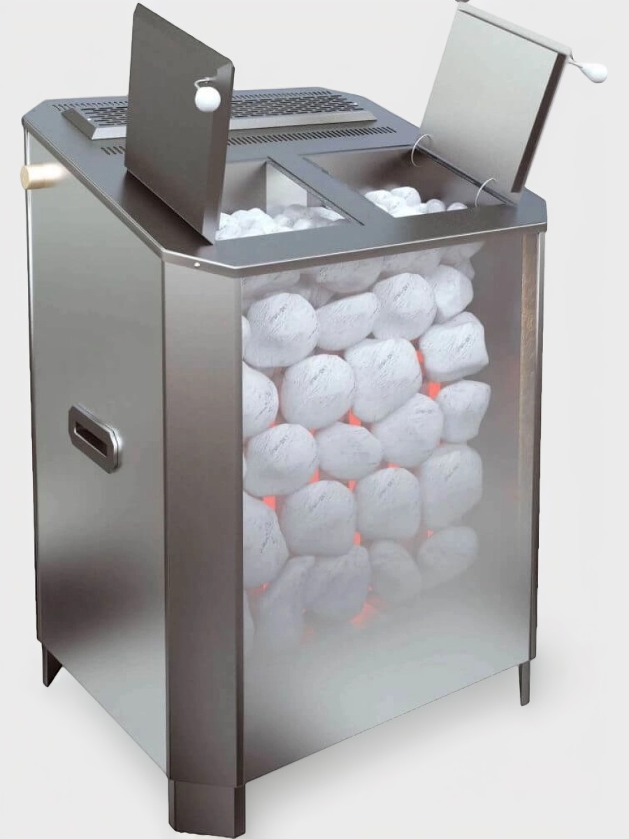 Учитывая отзывы и пожелания клиентов, в новых электропечах предусмотрена закрывающаяся дверью (дверями) теплоизолированная емкость для камней, нагрев которой осуществляется автономно, не зависимо от режима работы парогенератора. А сам парогенератор перегретого пара, в зависимости от исполнения и мощности электропечи, может работать в двух или трех режимах по интенсивности парообразования.